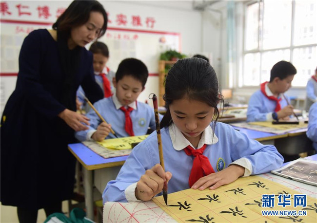 10月20日,滄州市實驗小學參加“校內(nèi)課后延時服務”的學生在老師的指導下練習書法。