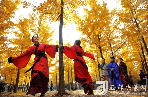 華服體驗者身著漢服盡享銀杏林浪漫醉人的美景