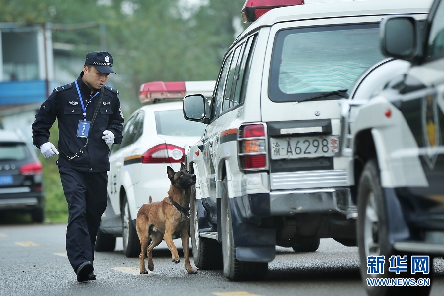 車輛搜爆項(xiàng)目中,警犬正在搜尋。新華網(wǎng)發(fā)