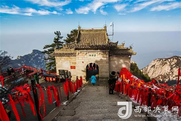 金鎖關(guān)是建在三峰口的一座城樓般石拱門,是經(jīng)五云峰通往東西南峰的咽喉要道,鎖關(guān)后則無路可通。杜甫《望岳》詩中“箭栝通天有一門”就是指的這里。道家認為,華岳為仙鄉(xiāng)神府,只有過了通天門,才算進入仙境。所以有“過了金鎖關(guān),另是一重天的”的民謠。
