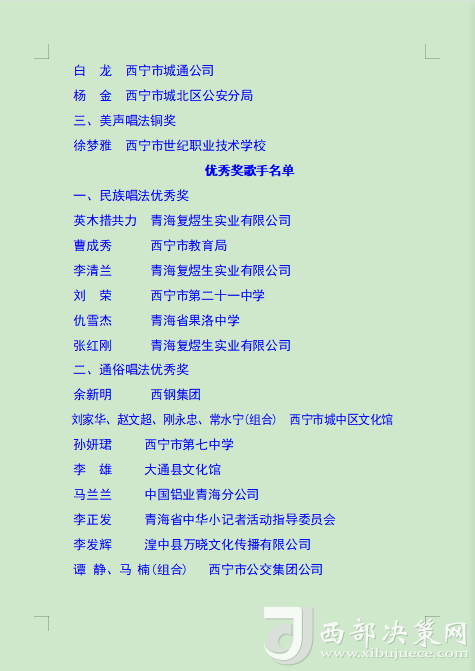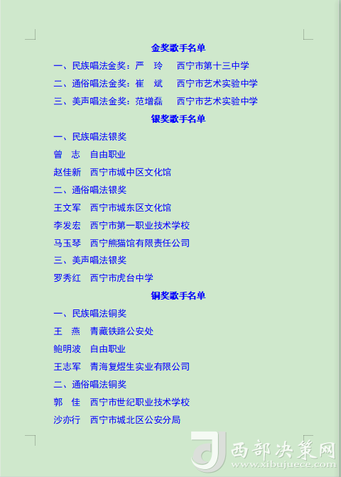 本次比賽旨在通過(guò)歌手們的激情演繹,增強(qiáng)全市廣大職工群眾的獲得感、幸福感、安全感,展現(xiàn)西寧市職工群眾的時(shí)代風(fēng)貌,進(jìn)一步營(yíng)造弘揚(yáng)勞模精神、勞動(dòng)精神、工匠精神的濃厚氛圍,為更高水平打造綠色發(fā)展樣板城市建設(shè)新時(shí)代幸福西寧增強(qiáng)信心、凝聚力量。(后附獲獎(jiǎng)名單)。