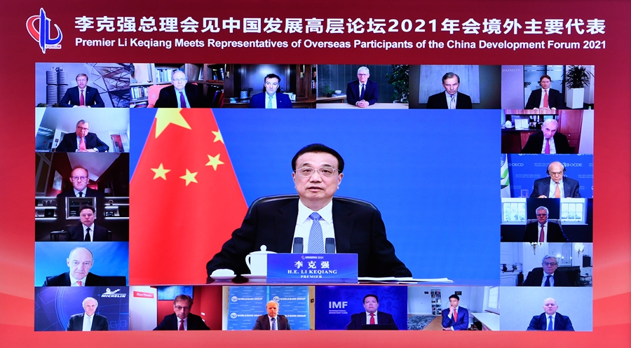 國務院總理李克強3月22日晚在人民大會堂以視頻方式會見出席中國發(fā)展高層論壇2021年年會的境外代表。來自世界五百強企業(yè)的負責人、國際知名學術研究機構的專家學者和主要國際組織代表等參加。