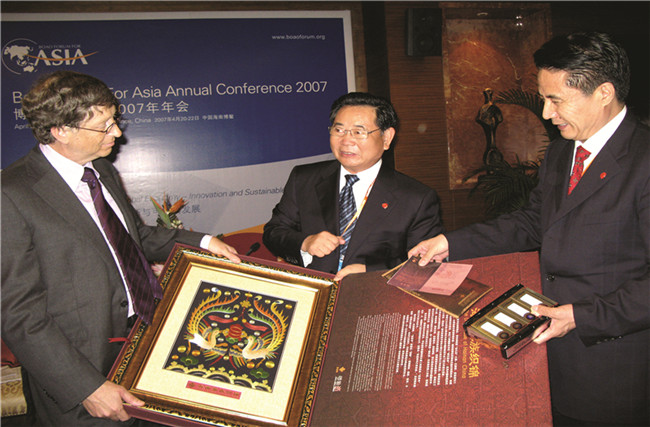 時(shí)任海南省委書記衛(wèi)留成、省長羅保銘向微軟公司董事長比爾.蓋茨贈(zèng)送黎錦禮品