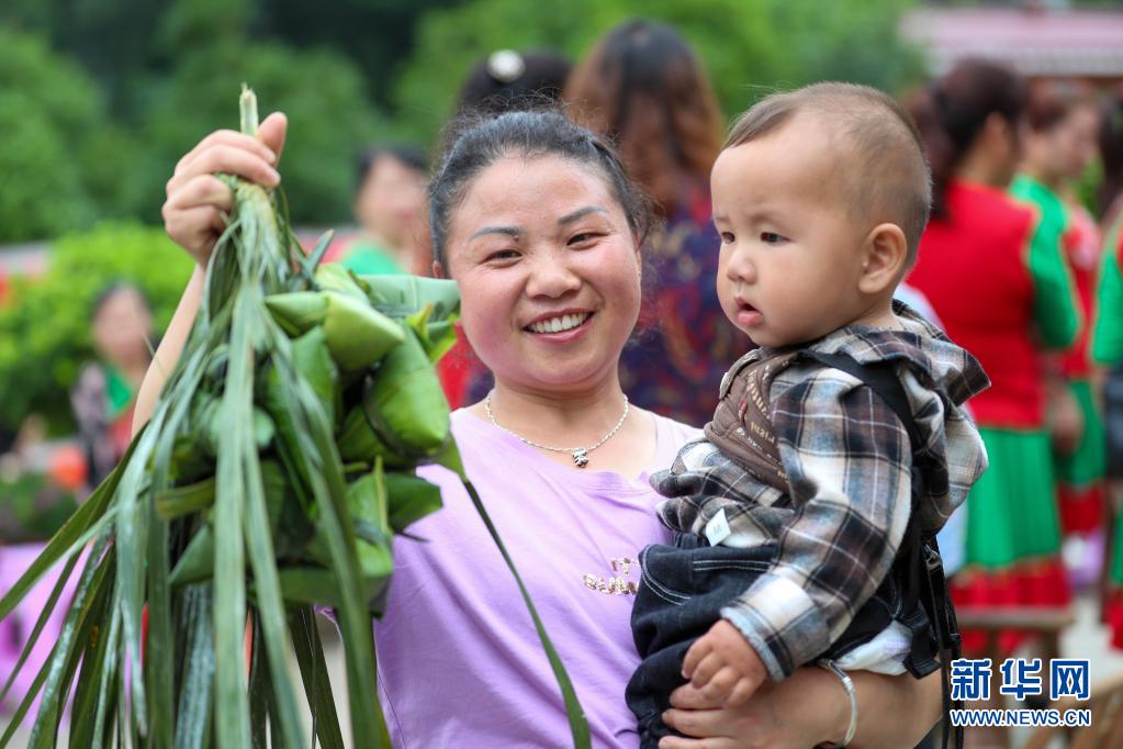 6月2日,貴州省銅仁市玉屏侗族自治縣亞魚鄉(xiāng)郭家灣村村民展示自己包的粽子。新華社發(fā)(胡攀學攝)