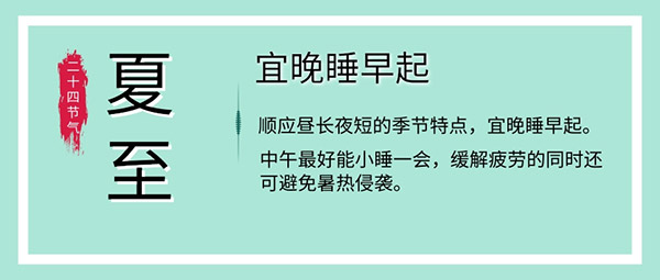 夏至節(jié)氣想要預(yù)防疾病發(fā)生,人們應(yīng)首先保持輕松愉快的心情,忌惱怒憂郁,使氣機(jī)宣暢、通泄自如。另外,夏天晝長夜短,且夜間溫度也較高,心靜自然涼最是保證”陰陽平衡”,能降低心血管疾病發(fā)作風(fēng)險。