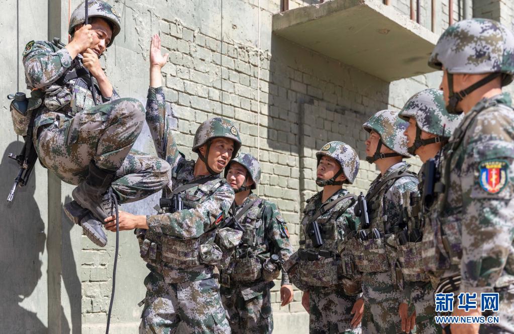 陸軍第76集團軍某特戰(zhàn)旅特戰(zhàn)營營長劉近(左二)為戰(zhàn)士講解攀登動作要領(7月7日攝)。新華社發(fā)(陳浩 攝)