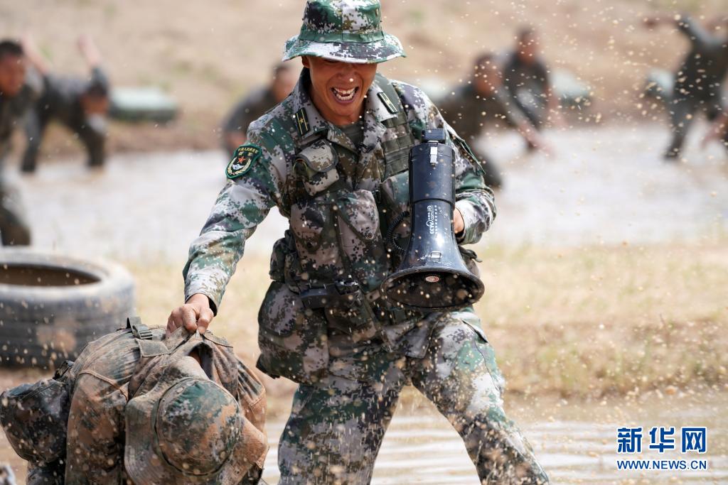 陸軍第76集團軍某特戰(zhàn)旅特戰(zhàn)營營長劉近組織特戰(zhàn)隊員進行泥潭摔擒訓練(7月14日攝)。新華社記者張永進攝