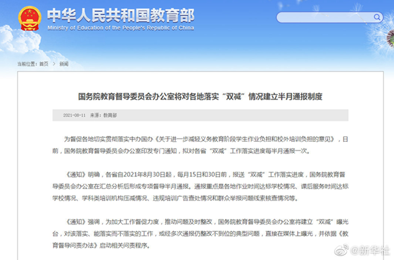 記者11日從教育部網(wǎng)站獲悉,國務(wù)院教育督導(dǎo)委員會(huì)辦公室日前印發(fā)專門通知,擬對各省“雙減”工作落實(shí)進(jìn)度每半月通報(bào)一次。據(jù)悉,各省自2021年8月30日起,每月15日和30日前,報(bào)送“雙減”工作落實(shí)進(jìn)度,國務(wù)院教育督導(dǎo)委員會(huì)辦公室在匯總分析后形成專項(xiàng)督導(dǎo)半月通報(bào)。通報(bào)重點(diǎn)是各地作業(yè)時(shí)間達(dá)標(biāo)學(xué)校情況、課后服務(wù)時(shí)間達(dá)標(biāo)學(xué)校情況、學(xué)科類培訓(xùn)機(jī)構(gòu)壓減情況、違規(guī)培訓(xùn)廣告查處情況和群眾舉報(bào)問題線索核查情況等。(記者王鵬)