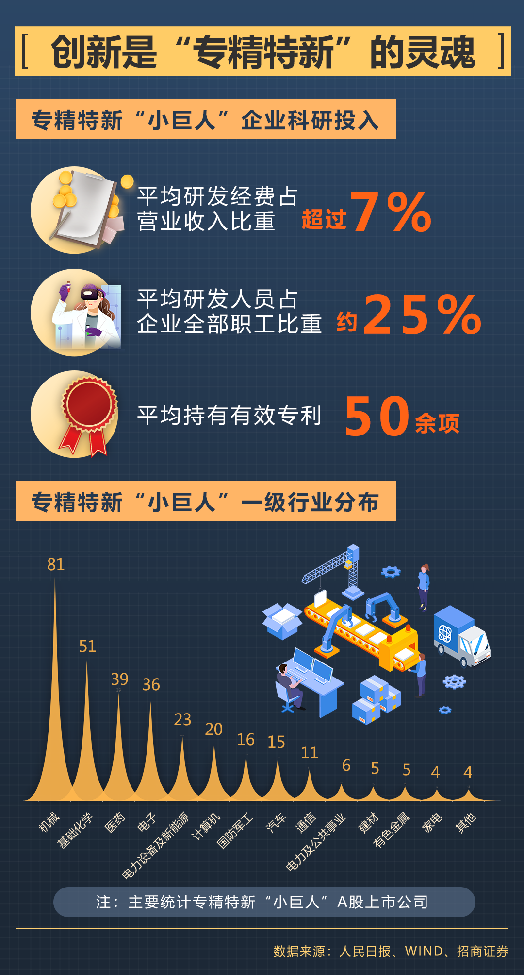 苦練創(chuàng)新“內(nèi)功”,研發(fā)投入很重要。專精特新“小巨人”企業(yè)平均研發(fā)經(jīng)費(fèi)占營業(yè)收入比重超過7%,平均研發(fā)人員占企業(yè)全部職工比重約為25%,平均持有有效專利50余項(xiàng)。它們都是應(yīng)用新技術(shù)、新工藝、新材料、新模式,不斷迭代產(chǎn)品和服務(wù)的創(chuàng)新“專家”。