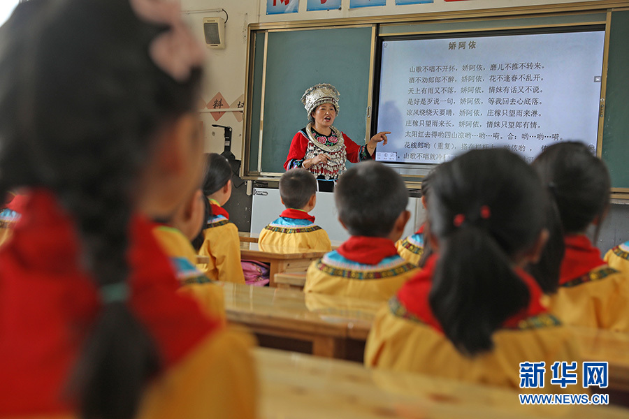 在教室內(nèi),任茂淑不僅面對面地教唱,還細心地為孩子們講解民歌的內(nèi)涵。她說,自己作為一名非遺傳承人,每學(xué)期都要到學(xué)校為孩子們教唱苗族民歌,通過傳承人走進課堂的方式,讓更多學(xué)生了解苗歌、傳唱苗族民歌,更好地保護和傳承這一非物質(zhì)文遺產(chǎn)。新華網(wǎng)發(fā)(趙勇 攝)