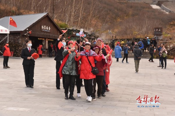 在溫泉廣場(chǎng),幾位游客手持自拍桿,邊跳舞邊拍攝,展現(xiàn)著來(lái)長(zhǎng)白山游玩的快樂(lè)心情。記者偶遇到精神飽滿的游客們手持國(guó)旗在廣場(chǎng)上唱響《歌唱祖國(guó)》,悠揚(yáng)的歌聲縈繞在長(zhǎng)白山上空......