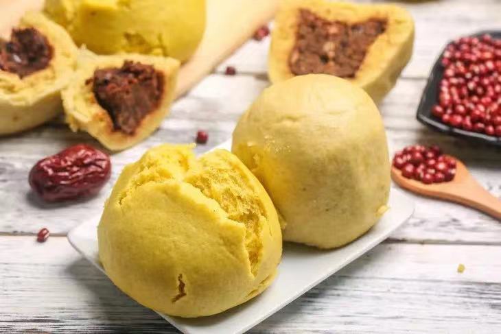 黃饃饃是流行于陜北地區(qū)的一種傳統(tǒng)名小吃,原料由硬糜子面發(fā)酵,包裹蒸煮好的紅棗、紅豆擠壓摻合成的豆棗泥餡蒸制而成,口感松軟帶甜,營養(yǎng)豐富易消化。因其顏色呈黃色,所以名為“黃饃饃”。又因風味獨特,曾上過紀錄片《舌尖上的中國》。