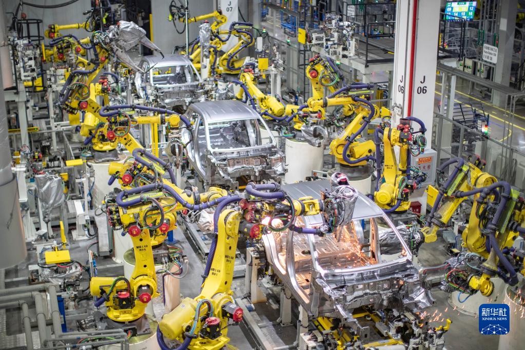 在重慶金康新能源汽車有限公司,智能化焊接機器人在進(jìn)行焊接作業(yè)(4月2日攝)。新華社記者 黃偉 攝