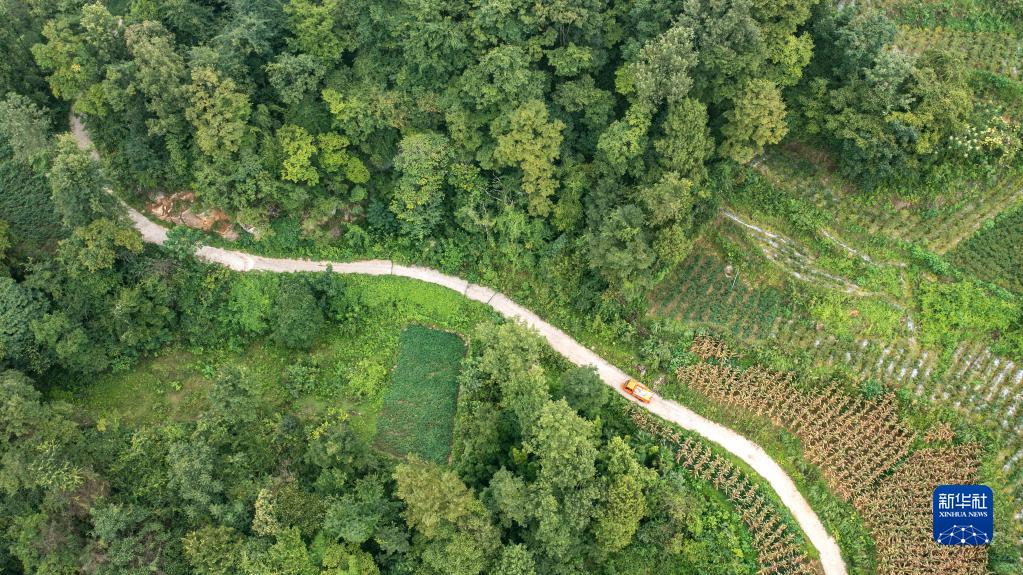 收購(gòu)辣椒的小貨車行駛在貴州省湄潭縣梭塘村的鄉(xiāng)間小路上(8月29日攝,無(wú)人機(jī)照片)。新華社記者 陶亮 攝