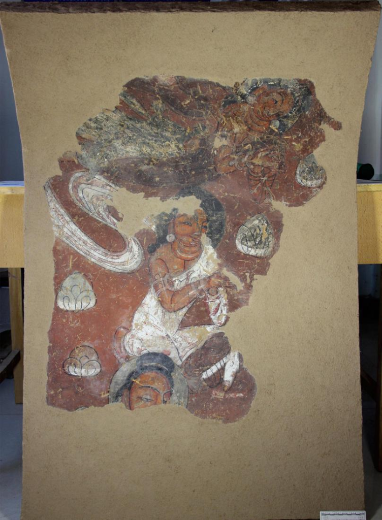 揭取修復(fù)的北涼弧形重層壁畫中的飛天部分。