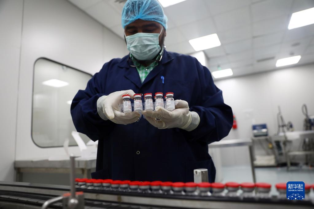 在埃及吉薩的埃及生物制品與疫苗公司疫苗生產(chǎn)廠,工作人員對貼標的新冠疫苗進行裝盒前準備(2021年9月6日)。新華社發(fā)(艾哈邁德·戈馬攝)