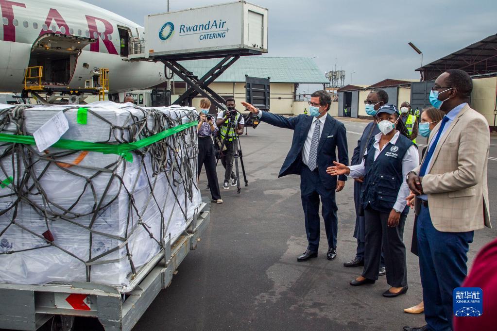 盧旺達衛(wèi)生部長達尼埃爾·恩加米杰(右一)等官員在基加利國際機場查看該國首批通過COVAX計劃收到的新冠疫苗(2021年3月3日)。新華社發(fā)(西里爾·恩德格亞攝)