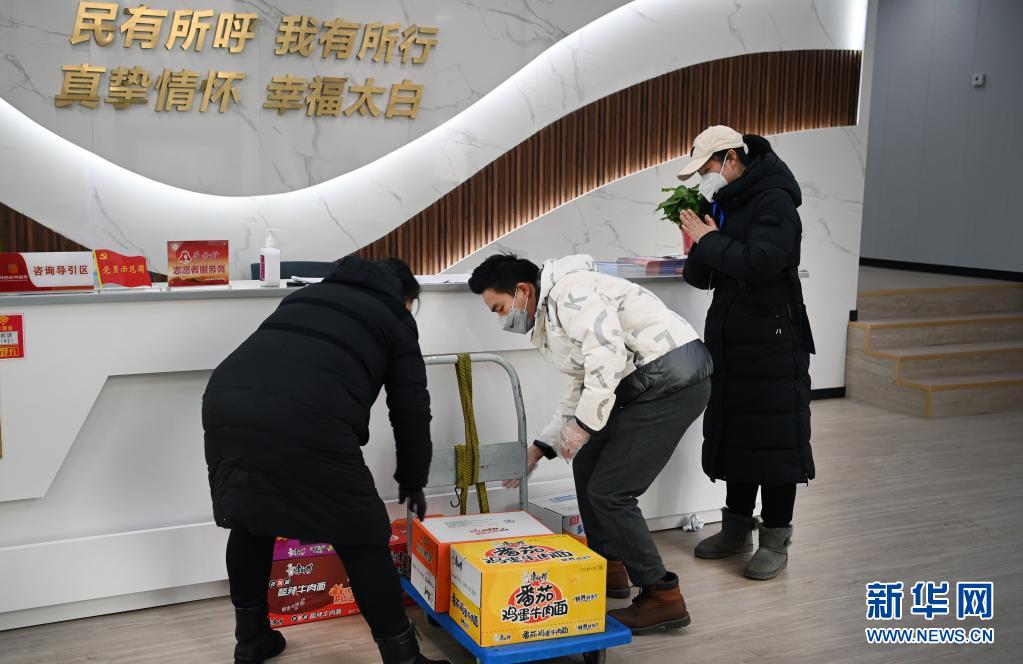 12月27日,社區(qū)居民(左)專門送來方便面等食品,慰問志愿者們。新華社記者 陶明 攝