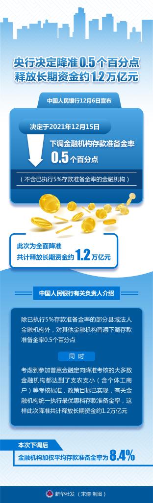 中國人民銀行12月6日宣布,決定于2021年12月15日下調(diào)金融機構(gòu)存款準備金率0.5個百分點(不含已執(zhí)行5%存款準備金率的金融機構(gòu))。此次為全面降準,共計釋放長期資金約1.2萬億元。新華社發(fā) 宋博 制圖