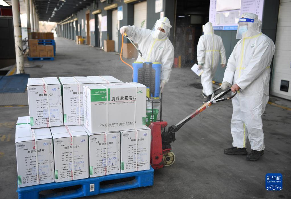 12月28日,陜藥集團(tuán)派昂醫(yī)藥公司工作人員對(duì)即將入庫(kù)的藥品進(jìn)行消殺。新華社記者 邵瑞 攝