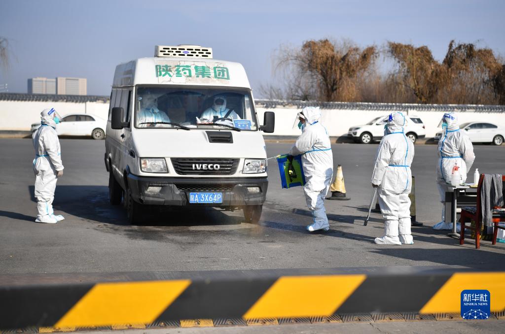 12月28日,陜藥集團(tuán)派昂醫(yī)藥公司工作人員對(duì)進(jìn)入園區(qū)的運(yùn)輸車輛進(jìn)行消殺。新華社記者 邵瑞 攝