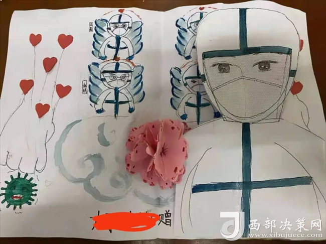 12月13日23時,第一例患者收住隔離病區(qū)?;純喝朐簳r全身感染,癥狀重,精神狀況差,哭鬧拒絕吃藥。為了安撫孩子焦慮情緒,隔離病區(qū)醫(yī)護人員輪流進入病房,陪患兒玩耍,科室安排專人,購買孩子需要的跳繩、皮筋、折紙、水果等生活用品,功夫不負有心人,經(jīng)過醫(yī)護人員耐心、細心地陪伴,孩子的情緒逐漸平靜下來,并積極配合治療,患兒最終診斷為“急性化膿性扁桃體炎、流行性感冒、急性支氣管炎”。三天后,體溫恢復正常,精神狀況明顯好轉(zhuǎn)。12月22日,患兒痊愈出院,為了表達感激之情,她動手為隔離病區(qū)工作人員送上自己精心做的一幅手工畫,向科室醫(yī)護人員敬獻一面錦旗。