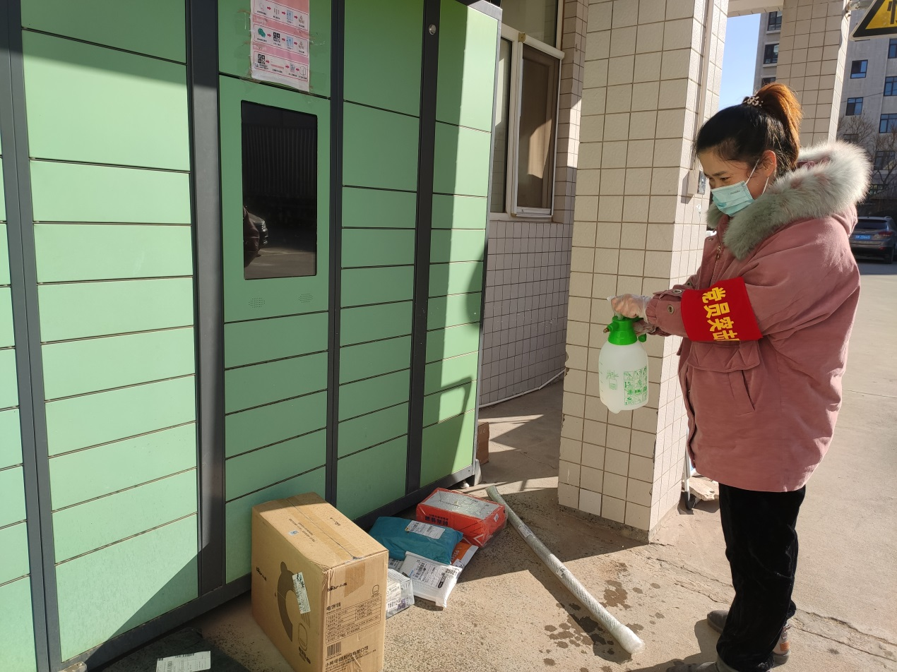 黨員突擊隊隊員索媛在值守小區(qū)對快遞進行消毒