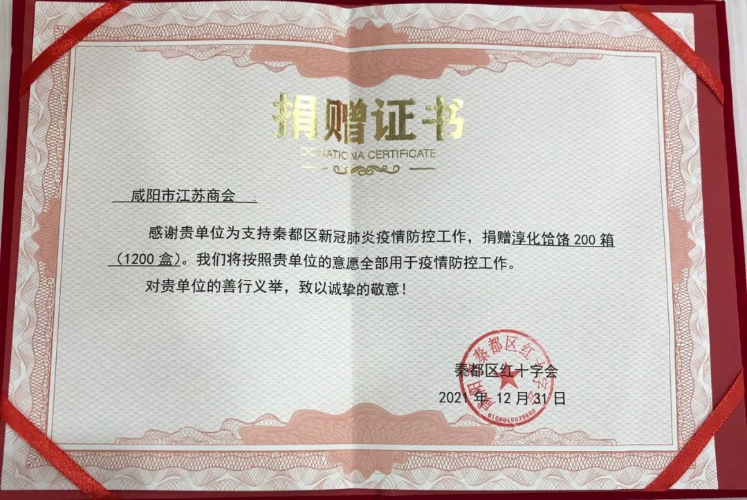 面對新一輪疫情,咸陽市江蘇商會(huì)及會(huì)員企業(yè)以不同的方式表達(dá)對咸陽市一線工作人員的關(guān)懷、對咸陽戰(zhàn)“疫”的支持,展現(xiàn)了一幕幕一心共同抗疫情的感人畫面,充分展現(xiàn)了咸陽市江蘇商會(huì)助力抗擊疫情的決心和信心,秦都區(qū)紅十字會(huì)向咸陽市江蘇商會(huì)頒發(fā)捐贈(zèng)證書。