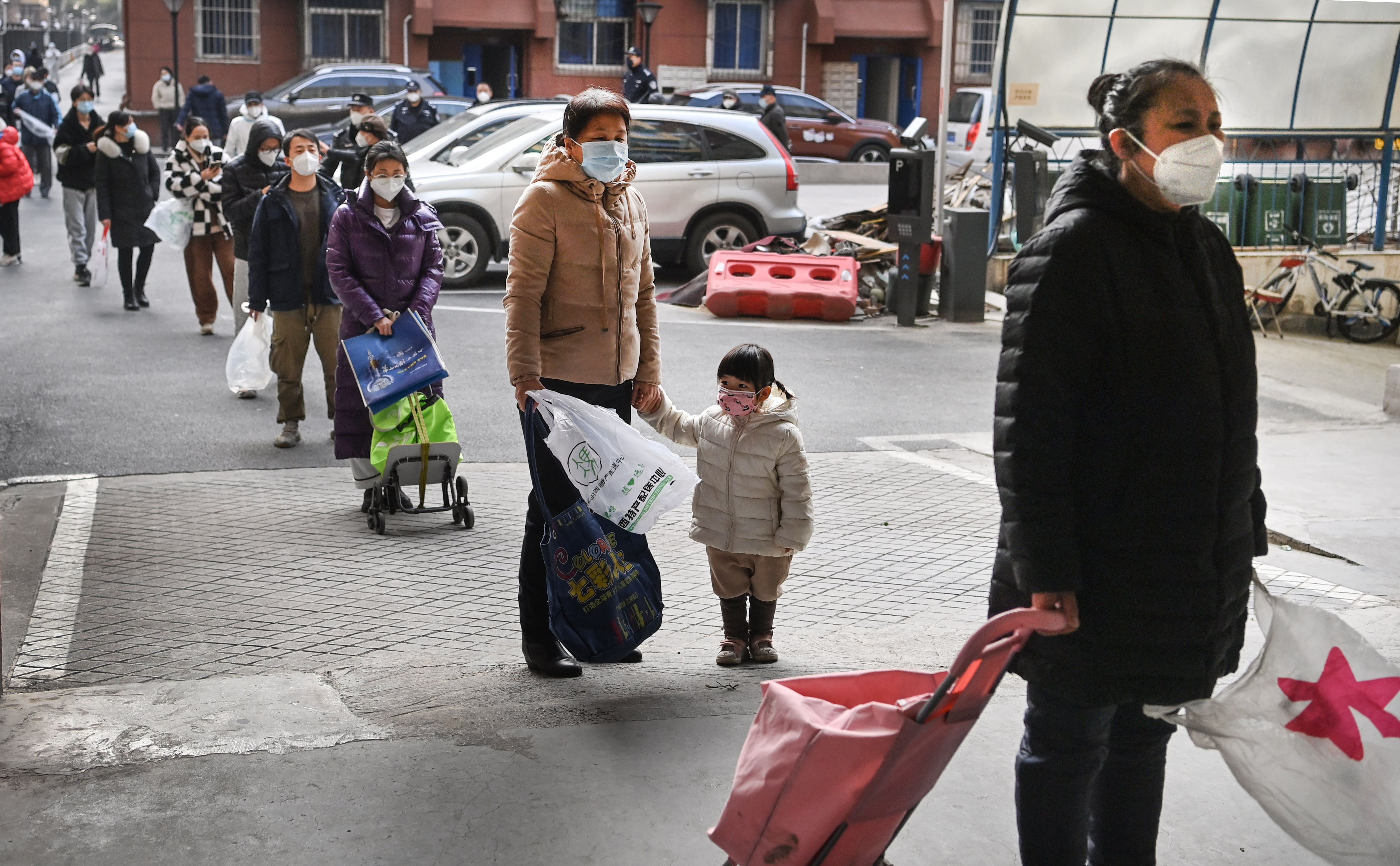 1月10日,雁塔區(qū)科技路一小區(qū)的居民排隊領取愛心人士捐贈的生活物資。新華社記者 陶明 攝