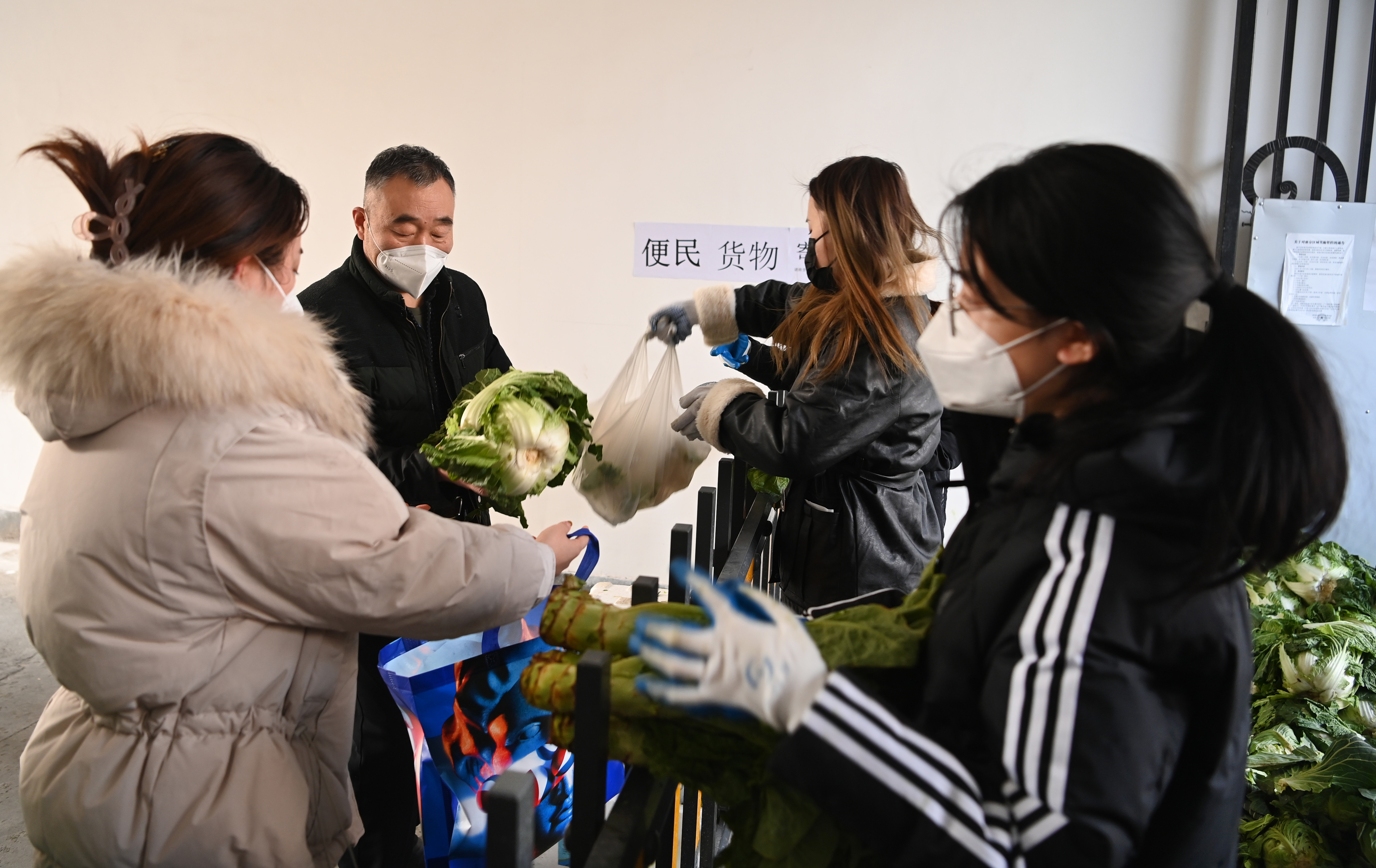 1月10日,雁塔區(qū)科技路一小區(qū)的工作人員在為居民配送愛心人士捐贈的蔬菜。新華社記者 陶明 攝