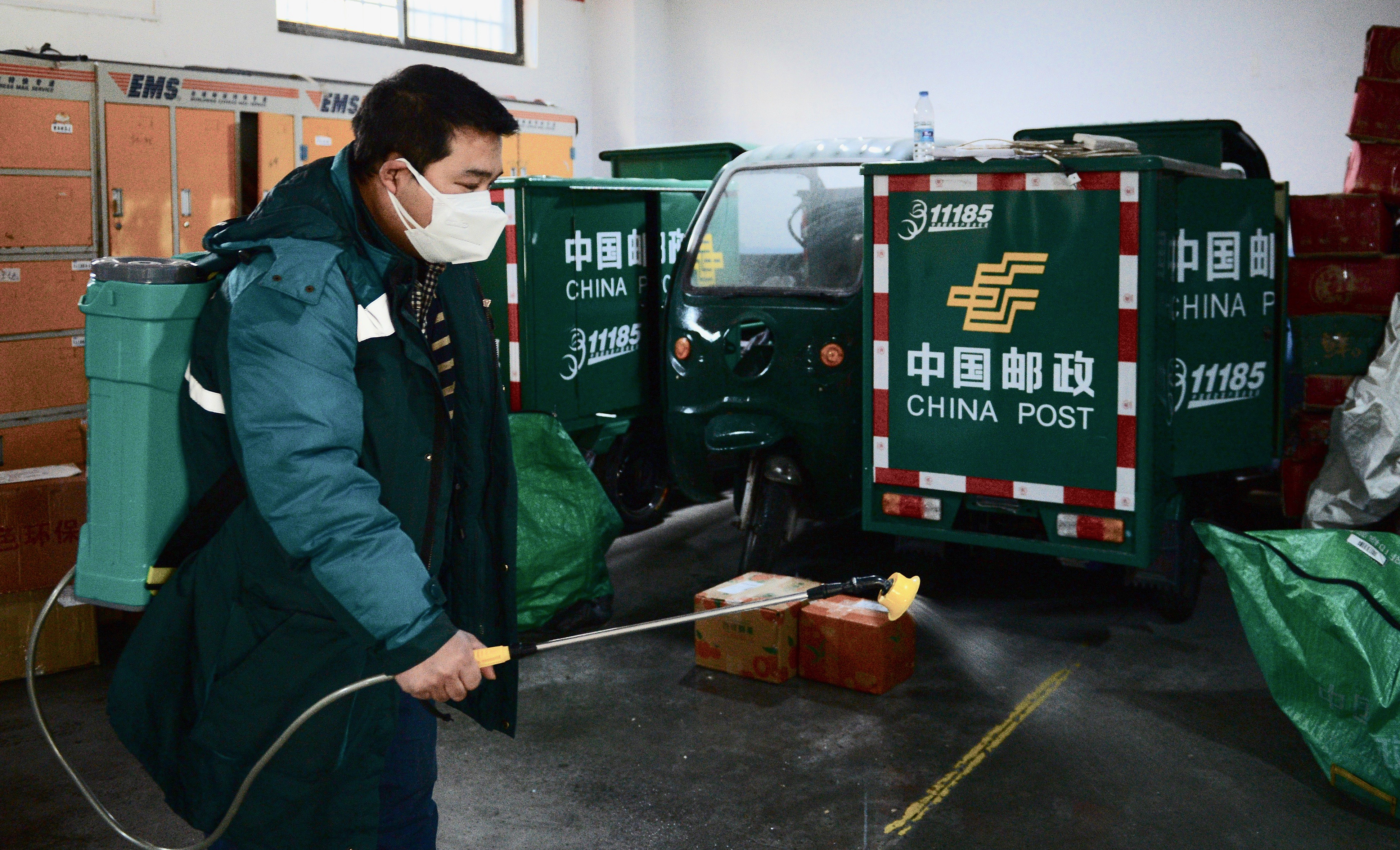 1月13日,中國(guó)郵政西安經(jīng)開分公司的員工在對(duì)倉(cāng)庫(kù)進(jìn)行消殺。 新華社發(fā)(鄒競(jìng)一 攝)