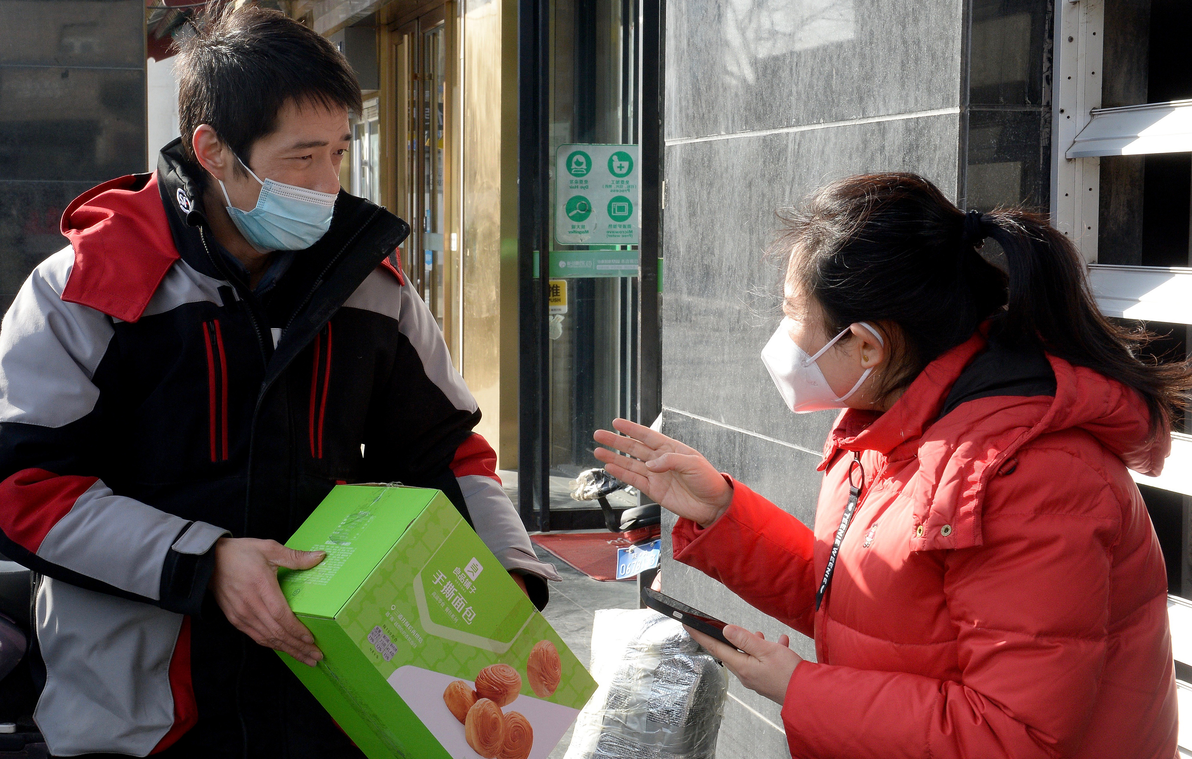 1月13日,在西安新城區(qū)北大街一公寓門口,順豐快遞員朱文軍(左)與顧客交流。 新華社發(fā)(鄒競(jìng)一 攝)