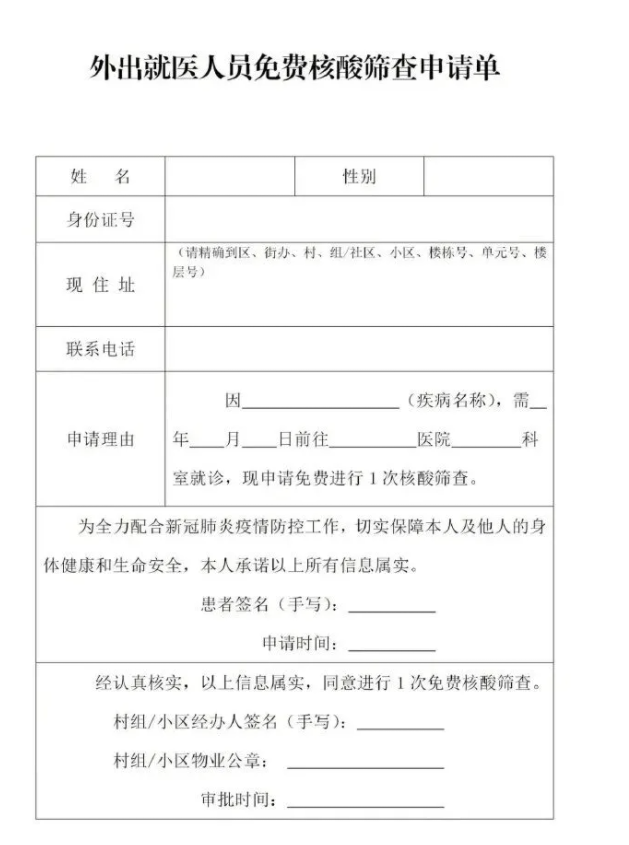 有就醫(yī)需求的居民請(qǐng)?zhí)顚憽锻獬鼍歪t(yī)人員免費(fèi)核酸篩查申請(qǐng)單》,經(jīng)村組或社區(qū)物業(yè)簽字蓋章后,前往新筑或新合社區(qū)衛(wèi)生服務(wù)中心進(jìn)行核酸篩查。