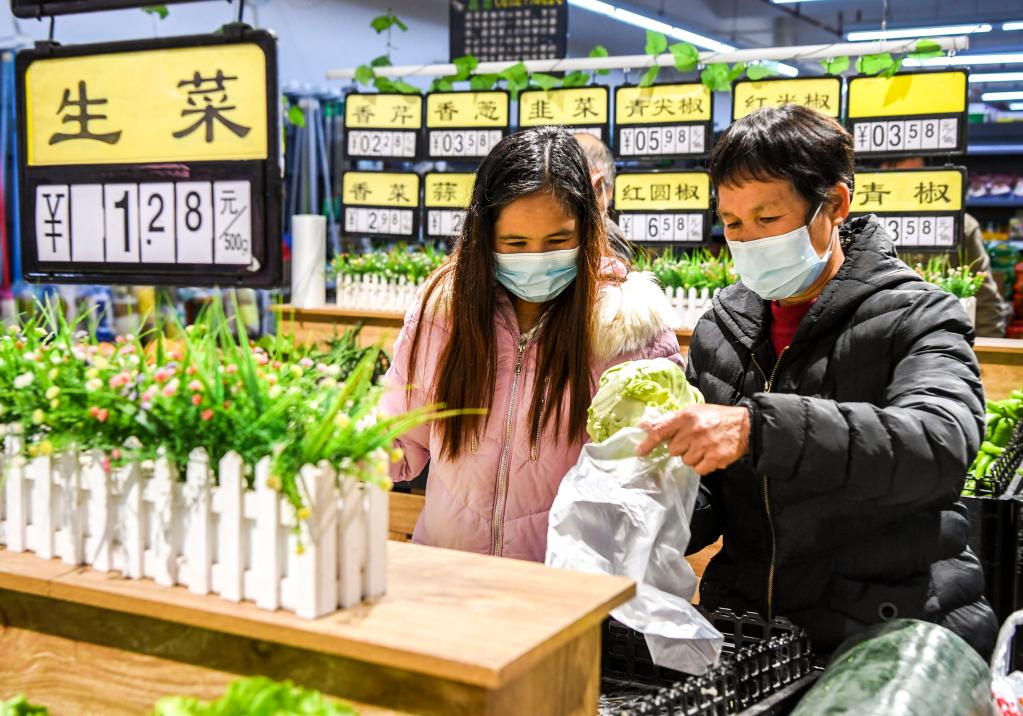 1月18日,居民在廣西興業(yè)縣“老鄉(xiāng)家園”配套建設(shè)的平價(jià)超市內(nèi)購買蔬菜。新華社記者 曹祎銘 攝