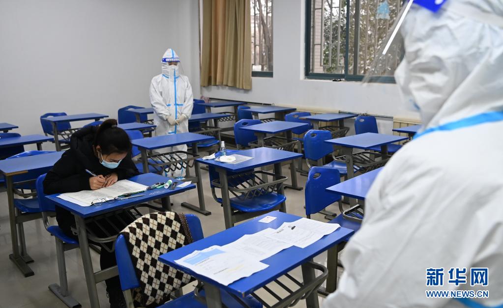 在2022年全國(guó)碩士研究生招生考試西安外國(guó)語(yǔ)大學(xué)考點(diǎn)隔離考區(qū),監(jiān)考人員在單人隔離考場(chǎng)監(jiān)考。考試中,監(jiān)考人員全程著防護(hù)服工作,學(xué)生午休時(shí)不出考區(qū),學(xué)校為每名考生提供免費(fèi)午餐。各方全力以赴為考生“保駕護(hù)航”,確??荚図樌M(jìn)行。新華社記者 劉瀟 攝