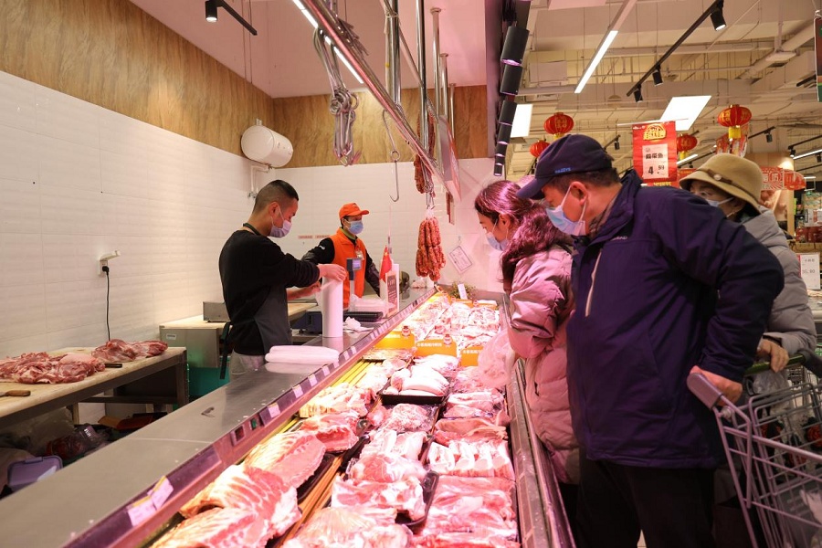 在蔬菜區(qū)、水產(chǎn)區(qū)、肉類區(qū),工作人員稱重、打包,忙得不亦樂乎。“今天一大早就有不少群眾來,各種肉類和火鍋食材賣得很快,還有顧客一次性買了800多元的肉卷。大家都說要多買點菜,好好吃頓火鍋。我們工作人員現(xiàn)場切肉、殺魚,也是忙得不可開交。”該超市一汪姓負(fù)責(zé)人表示,從上午的情況看,群眾購買商品的意愿都很強,大家對各類商品的需求都很大。