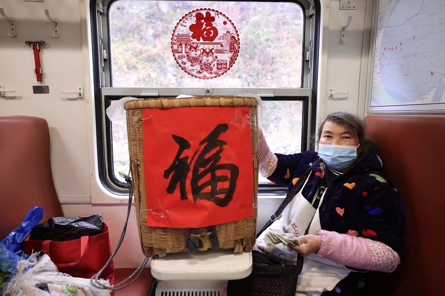 “各位老鄉(xiāng),早上好,今天是農(nóng)歷小年,我們將舉行送祝福活動(dòng)。”列車(chē)員衛(wèi)進(jìn)忠的話(huà)音剛落,就看見(jiàn)車(chē)廂里老鄉(xiāng)們急忙圍攏過(guò)來(lái)。他把寫(xiě)好的春聯(lián)送給身邊背著背簍的一位老人,將一張福字貼在了背簍上。拿到對(duì)聯(lián)、福字的老人滿(mǎn)臉笑容,連忙道謝。“火車(chē)快開(kāi), 別讓我等待,火車(chē)快開(kāi),請(qǐng)你趕快送我到遠(yuǎn)方家鄉(xiāng)……”在與旅客互動(dòng)中,列車(chē)員李?lèi)?ài)民激情演唱歌曲《火車(chē)快開(kāi)》,送去列車(chē)工作人員的新春祝福,引來(lái)旅客們陣陣掌聲。