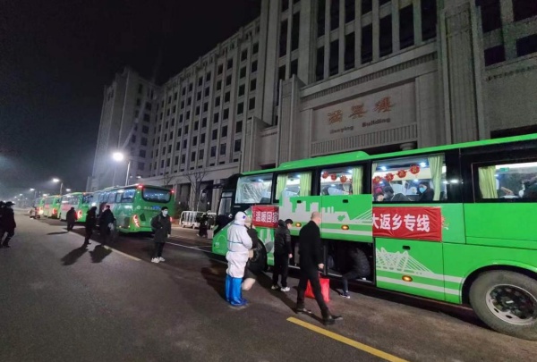 為了保障將創(chuàng)新港學生閉環(huán)轉運至西安“兩站一場”,灃西新城對接西咸公交集團,協(xié)調了50輛公交車、大巴車,根據學生訂票時間制定班次,全程參與暖心返鄉(xiāng)行動,24小時不停歇,點對點將學生運送至“兩站一場”。