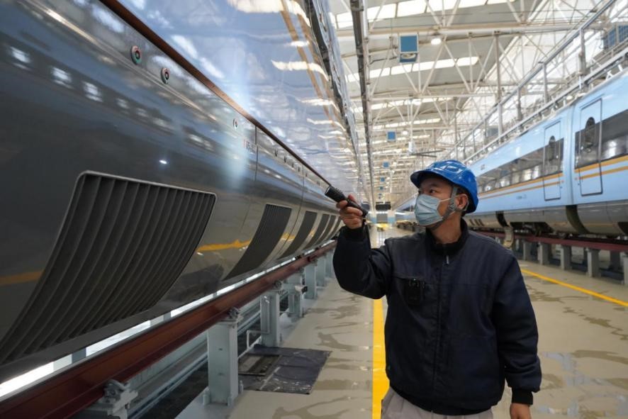 1月29日,在中國(guó)鐵路西安局集團(tuán)公司西安動(dòng)車(chē)段檢修庫(kù)內(nèi),質(zhì)檢車(chē)間質(zhì)檢三組質(zhì)檢員龔奇正檢查著動(dòng)車(chē)組走行部位,手中的可錄式手電一一掃過(guò)車(chē)輪、齒輪箱、閘片等配件,眼隨手動(dòng),緊盯著手電光照的地方,時(shí)不時(shí)伸手確認(rèn)配件安裝狀態(tài)。
