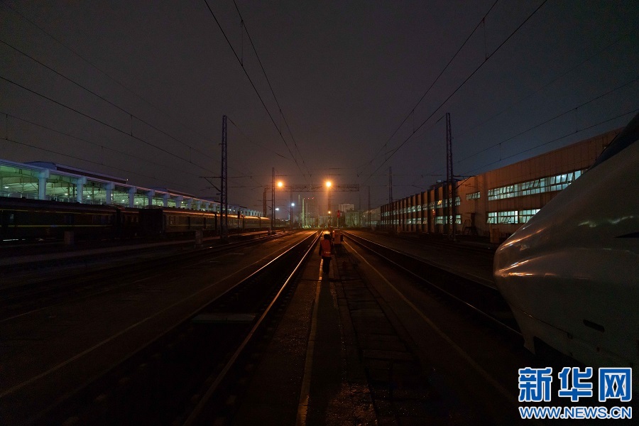 檢查完動車組,蘇盛行走在列車停車場內(nèi)。新華網(wǎng)發(fā) 趙磊 攝