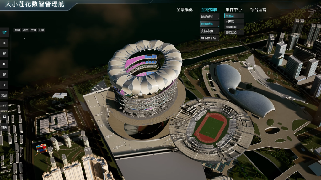 因外形酷似兩朵盛開的蓮花,杭州奧體中心主體育場和網(wǎng)球中心決賽館常被杭州市民昵稱為“大小蓮花”。走進奧體中心運營大廳,映入眼簾的是一塊超級大屏,名為“大小蓮花”數(shù)智管理艙,屏幕上呈現(xiàn)的是整個奧體園區(qū)的虛擬模型。