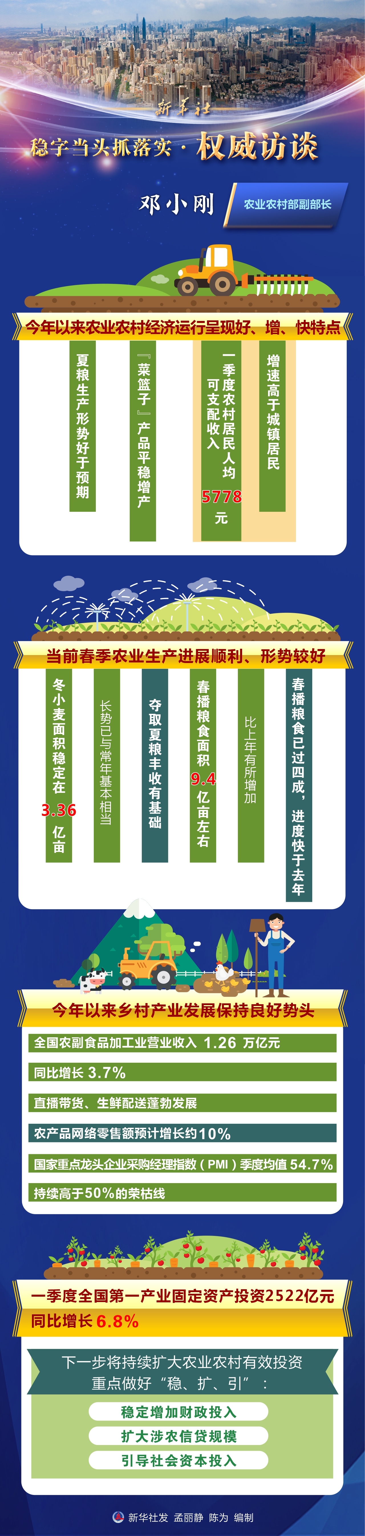 農(nóng)業(yè)農(nóng)村經(jīng)濟(jì)運(yùn)行呈現(xiàn)好、增、快的特點(diǎn):夏糧生產(chǎn)形勢好于預(yù)期,“菜籃子”產(chǎn)品平穩(wěn)增產(chǎn),一季度農(nóng)村居民人均可支配收入5778元,增速高于城鎮(zhèn)居民,脫貧地區(qū)農(nóng)民收入增速繼續(xù)快于全國農(nóng)村平均水平。下一步,我們將扎實(shí)推進(jìn)鄉(xiāng)村振興各項重點(diǎn)任務(wù),為經(jīng)濟(jì)社會大局穩(wěn)定提供堅實(shí)支撐。
