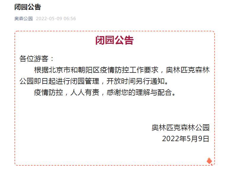 “奧森公園”微信公眾號9日發(fā)布閉園公告,根據(jù)北京市和朝陽區(qū)疫情防控工作要求,奧林匹克森林公園即日起進行閉園管理,開放時間另行通知。