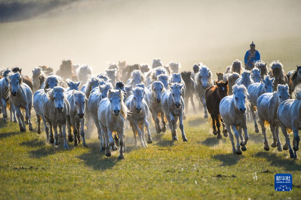 初夏時(shí)節(jié),內(nèi)蒙古錫林郭勒盟西烏珠穆沁旗的草原開始返青。當(dāng)?shù)啬撩褛s著馬匹,來到草原上馴馬,景象壯觀。