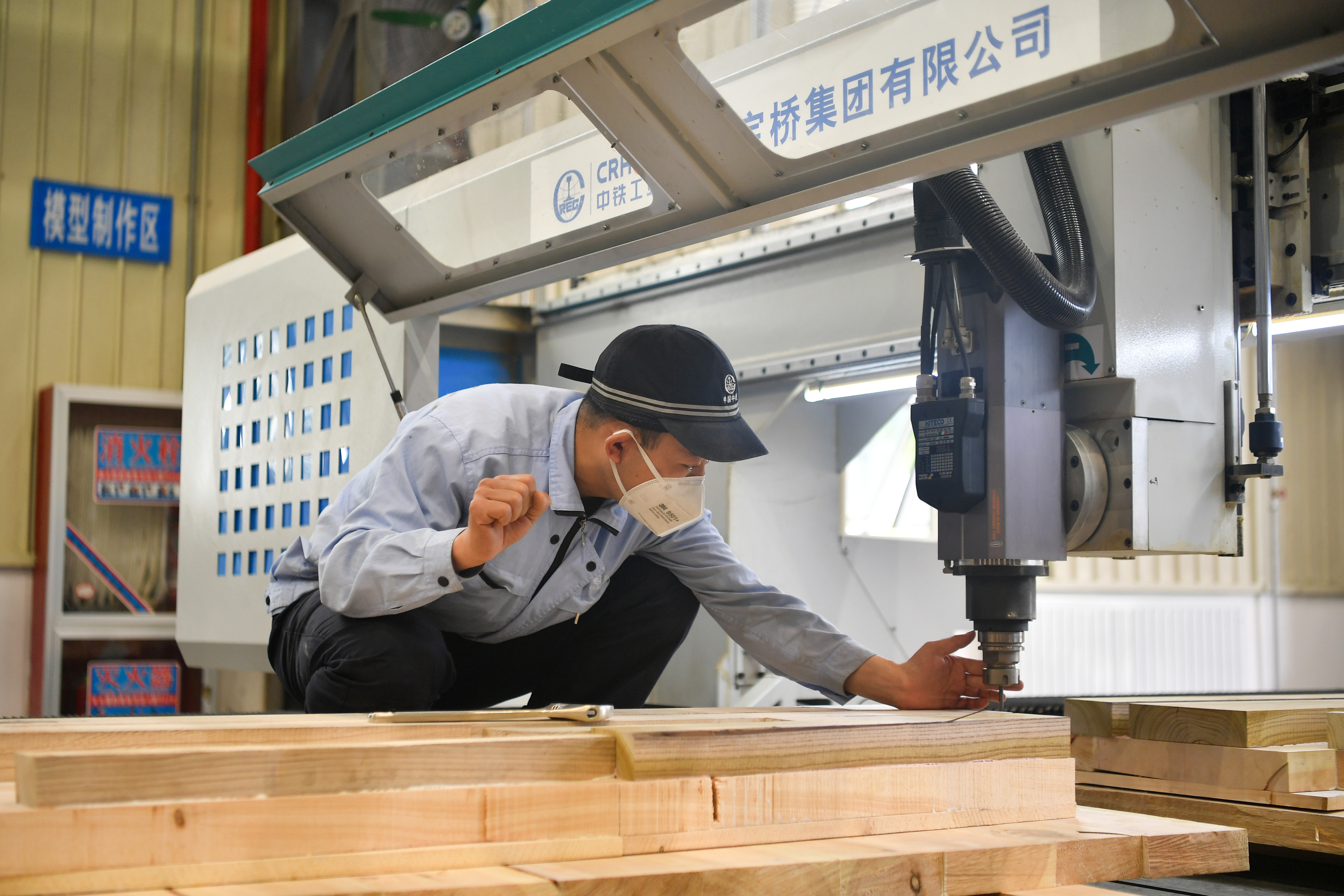 屏氣凝神,33歲的中鐵寶橋集團(tuán)技工錢歡,小心翼翼地扶著機(jī)床上粘合好的三層木板,將刀頭對準(zhǔn)畫好的中心線,進(jìn)行切割。刀頭落下,電光火石間,一段鐵路轍叉的模型在他的操作下逐漸成形。這是裝備制造業(yè)里最常見、也最重要的鑄模環(huán)節(jié)。