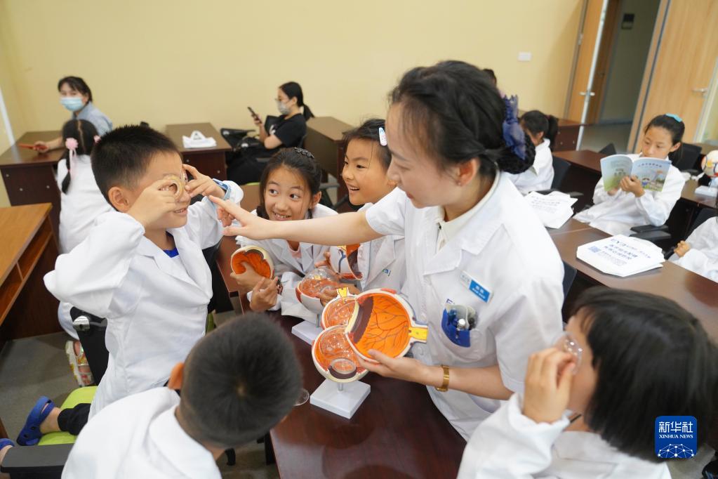 6月5日,在重慶市北碚區(qū)一家眼科醫(yī)院,一名驗光師在給孩子們講解眼球構造知識。新華社發(fā)(秦廷富 攝)