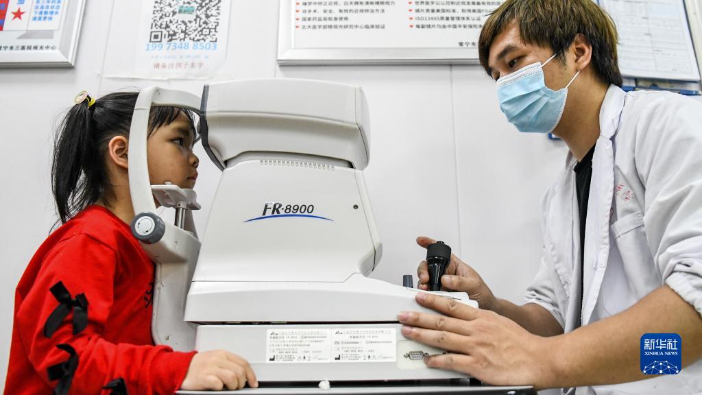 6月5日,湖南省常寧市第三人民醫(yī)院的醫(yī)護人員在為小朋友驗光。新華社發(fā)(周秀魚春 攝)