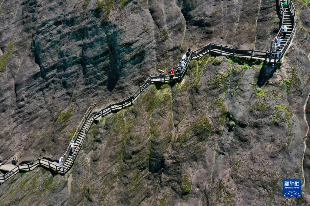 游客在武夷山景區(qū)攀登天游峰(6月6日攝,無人機(jī)照片)。新華社記者 姜克紅 攝