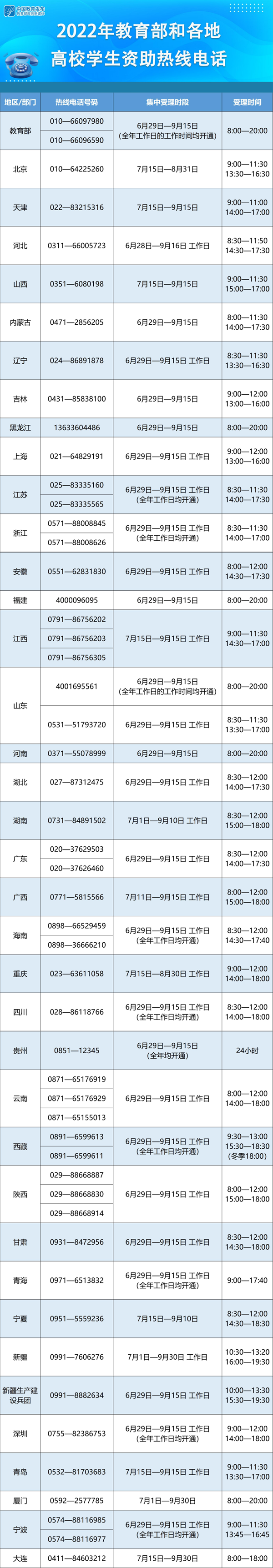 教育部要求各?。▍^(qū)、市)及所屬高校、中央高校學(xué)生資助管理部門均開通熱線電話,并結(jié)合實(shí)際情況自行確定集中受理時(shí)段和具體受理時(shí)間。