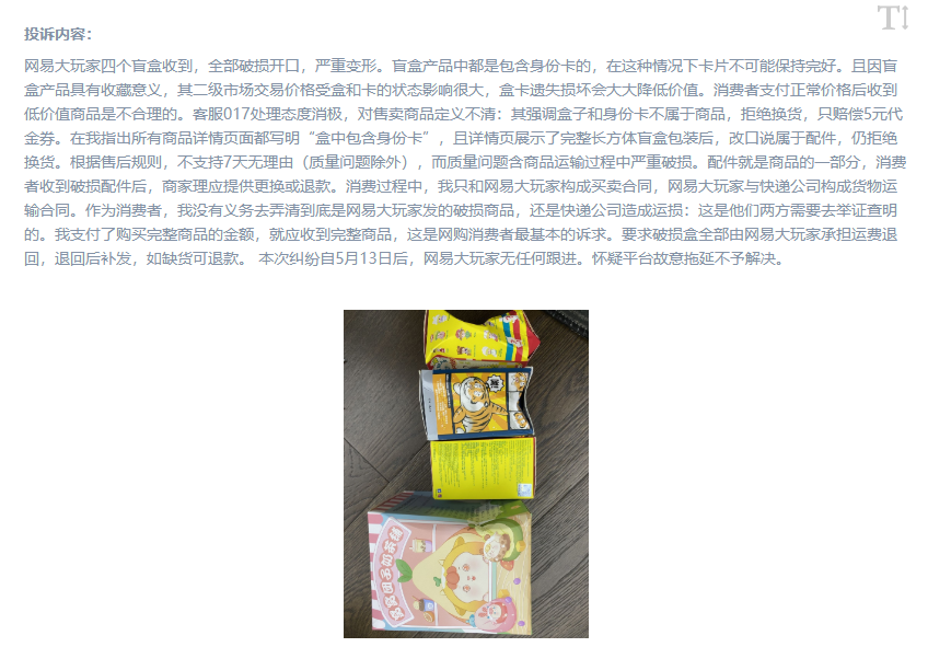 今年5月,在人民網(wǎng)“人民投訴”平臺(tái)上,一位網(wǎng)友“吐槽”了自己購(gòu)買(mǎi)盲盒時(shí)遇到的“糟心事”,其表示自己在某平臺(tái)購(gòu)買(mǎi)了盲盒玩具,收到時(shí)卻發(fā)現(xiàn)商品破損,但商家不同意更換,并故意拖延不予解決。